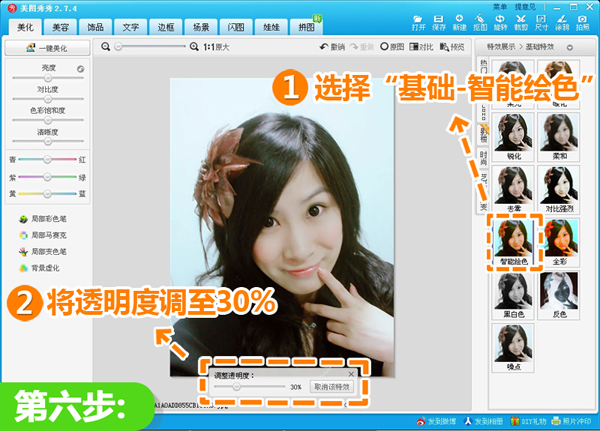 6、选择“基础-智能绘色”,并将透明度调至30%,增加照片色彩。