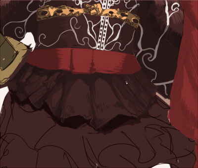 这是给衣服上色后的效果。上色时要注意衣服的褶皱,花纹也是,要沿着衣服的线条画才能有立体感。