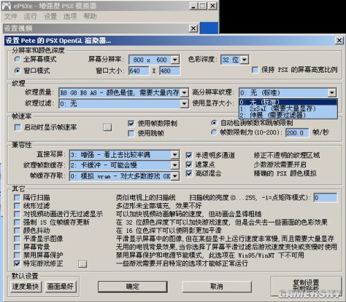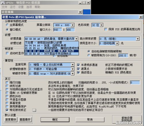 纹理质量:影响速度的关键之一,低配置选择R4G4B4A4,画面比R5G5B5A1差很多,不过速度快,中等配置选择R5G5B5A1,电脑非常好的话就选择R8G8B8A8#p#分页标题#e#
