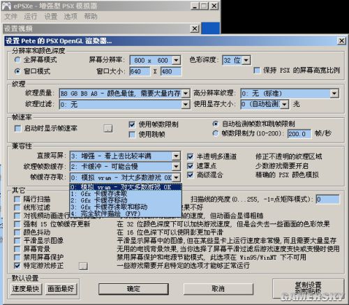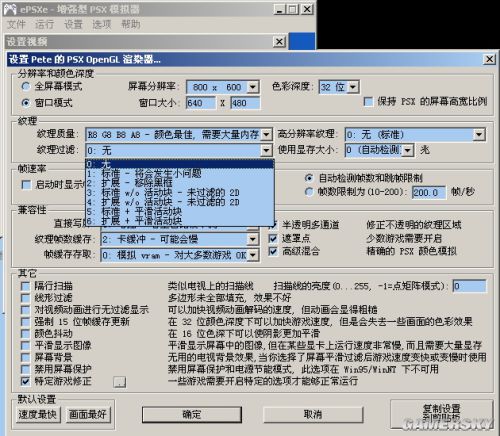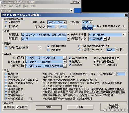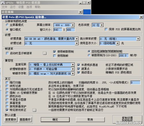 帧速率:因为现在电脑的性能比PS的性能要强得多 所以模拟后的速度比PS上正常进行的速度要快得多,这时就需要限制帧速率 通常要把使用帧数限制和帧数限制勾上 同时帧数限制填60或者70,太快或者太慢对游戏的进行都不是太好 60是能够使游戏顺畅运行比较好的一个参数,其他选项可以根据自己的电脑来设置。
