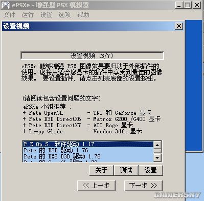 如果是3dfx Voodoo系列的显卡就选择Lewpy's Glide plugin;ATI Radeon的话选择Pete's D3D plugin;ATI Rage 128/Expert选择Pete's D3D plugin;如果是nVidia GeForce系列的显卡就选择Pete's OpenGl plugin;nVidia TNT系列选择Pete's OpenGl plugin;Matrox G200/G400选择Pete's D3D (DirectX 6)plugin;当然,如果你家里的电脑还在使用Geforce 4 MX440之前型号的或者是RadeonX1600之后的显卡的话就用P.E.Op.S.软件驱动1.17吧。