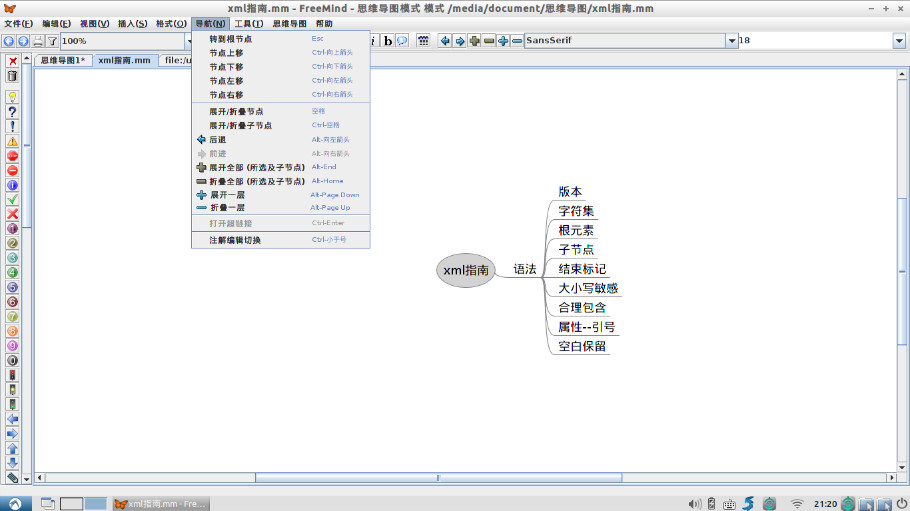 对于节点位置的操作,比如节点左移、上移、折叠、展开等,可以通过菜单栏中的“导航”命令进行。而复制、剪切、粘贴等操作则可以通过菜单栏的“编辑”命令进行。如下图