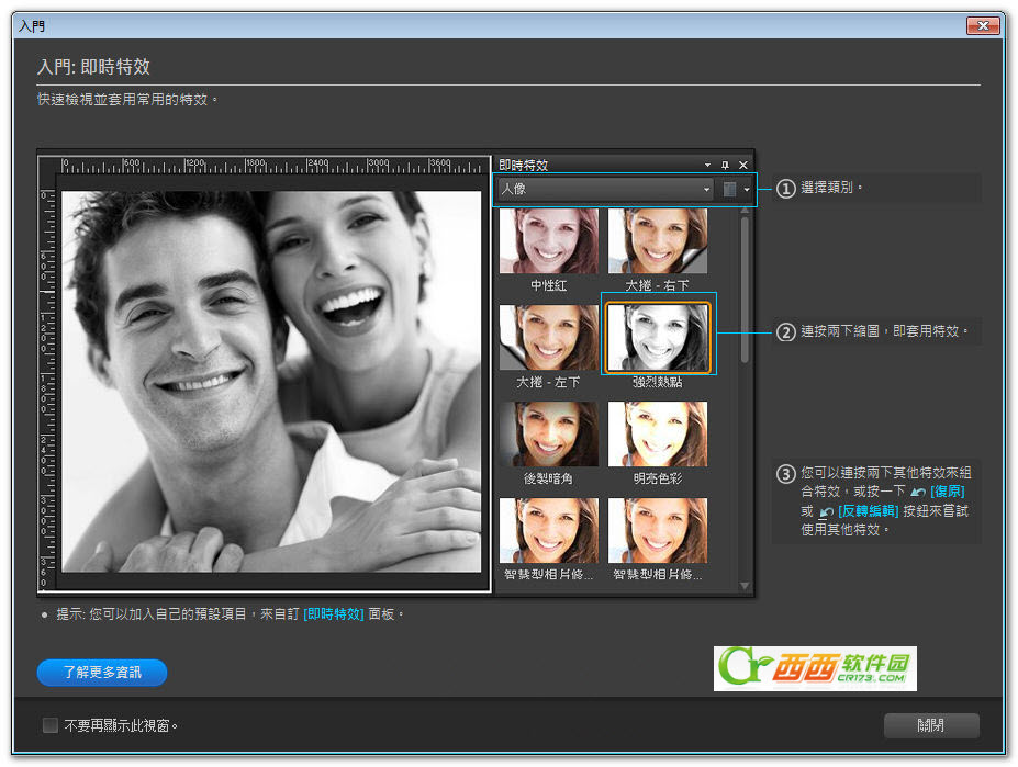 丰富的照片图像即时特效功能,选择好特效后双击即可应用到图片上