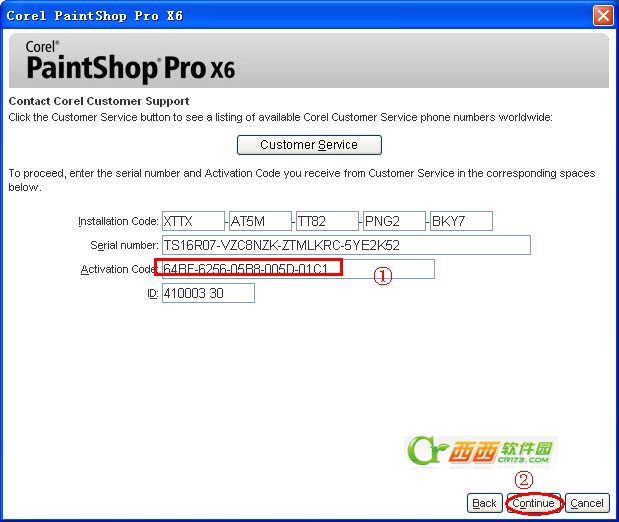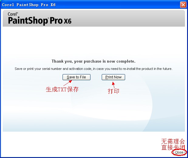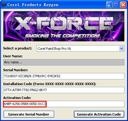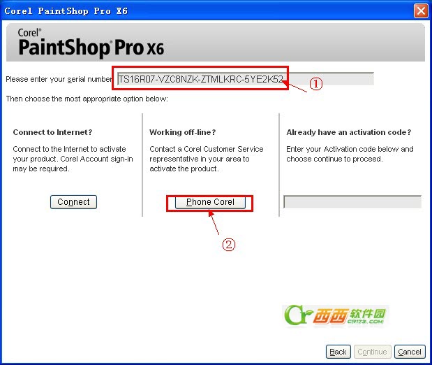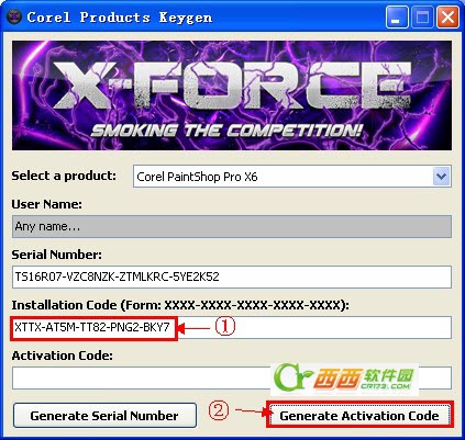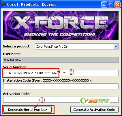 打开注册机,选择软件型号Corel PaintShop Pro X6,再点击生成序列号(1),再复制序列号(2),如下图