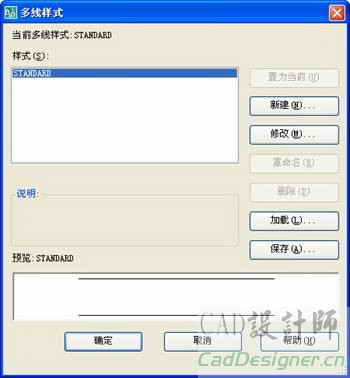 选择“格式”|“多线样式”命令(MLSTYLE),打开“多线样式”对话框。可以根据需要创建多线样式,设置其线条数目和线的拐角方式。