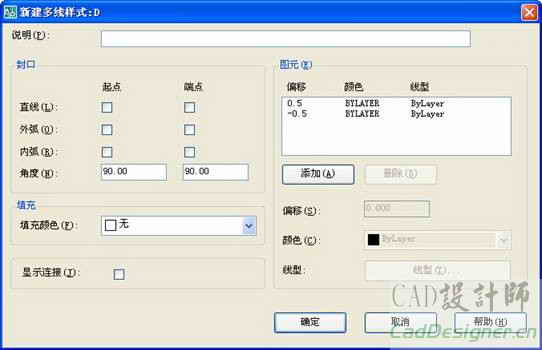 在“创建新的多线样式”对话框中,单击“继续”按钮,将打开“新建多线样式”对话框,可以创建新多线样式的封口、填充、元素特性等内容。