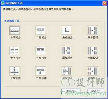 多线编辑命令是一个专用于多线对象的编辑命令,选择“修改”|“对象”|“多线”命令,可打开“多线编辑工具”对话框。该对话框中的各个图像按钮形象地说明了编辑多线的方法。
