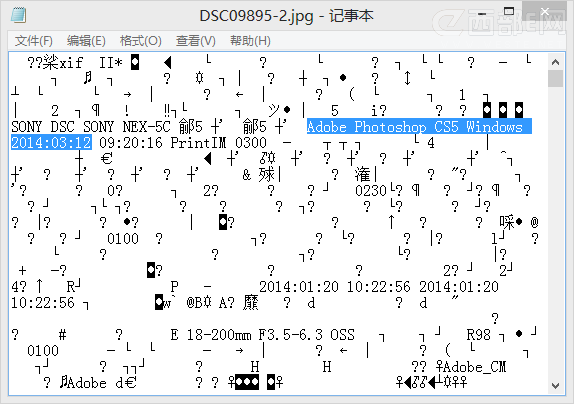 打开“记事本”,将照片拖到记事本中,会有一堆乱码呈现在你面前。仔细看就会发现一些端倪。