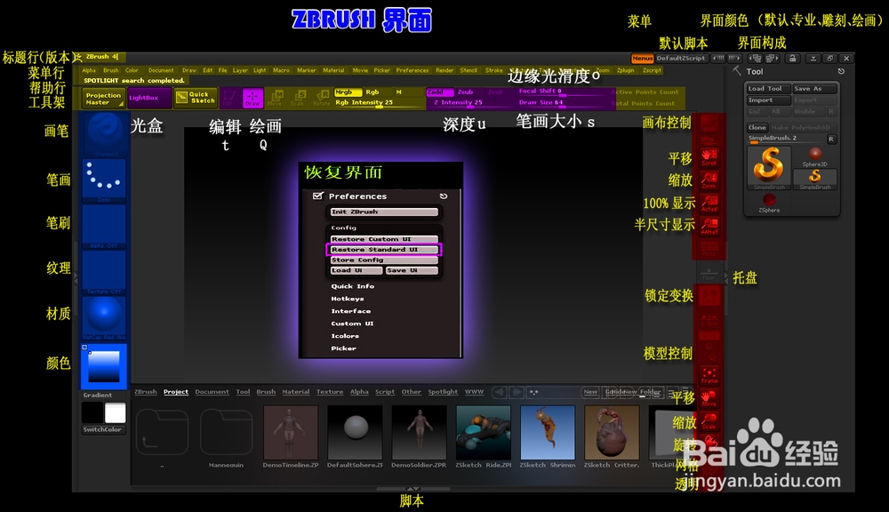 下面向大家介绍一下ZBrush界面和基本操作。