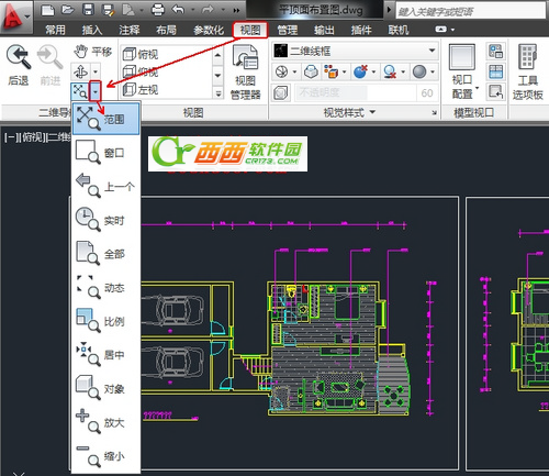 3.在AutoCAD2013中文版顶部菜单栏选择切换至“视图”,从打开的工具栏中选择“范围”中的倒三角 ,从弹出的下拉列表中选择相应的缩放方式。
