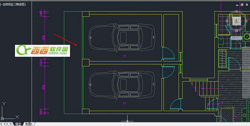 如把下图中车库部分方法,选择“窗口缩放”工具,在AutoCAD2013绘图窗口中需要放大的区域的一角单击鼠标左键,然后松开鼠标左键拖动出矩形。
