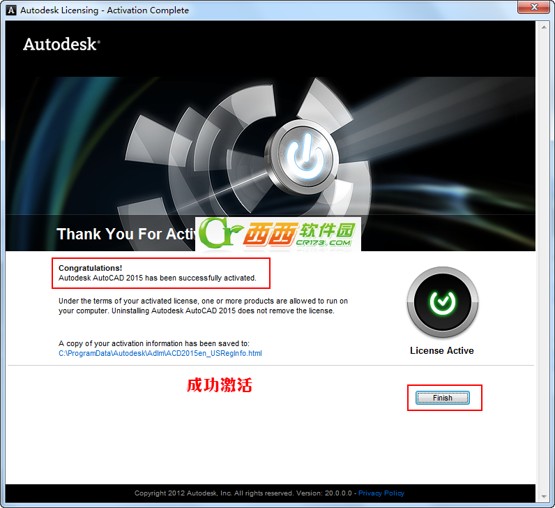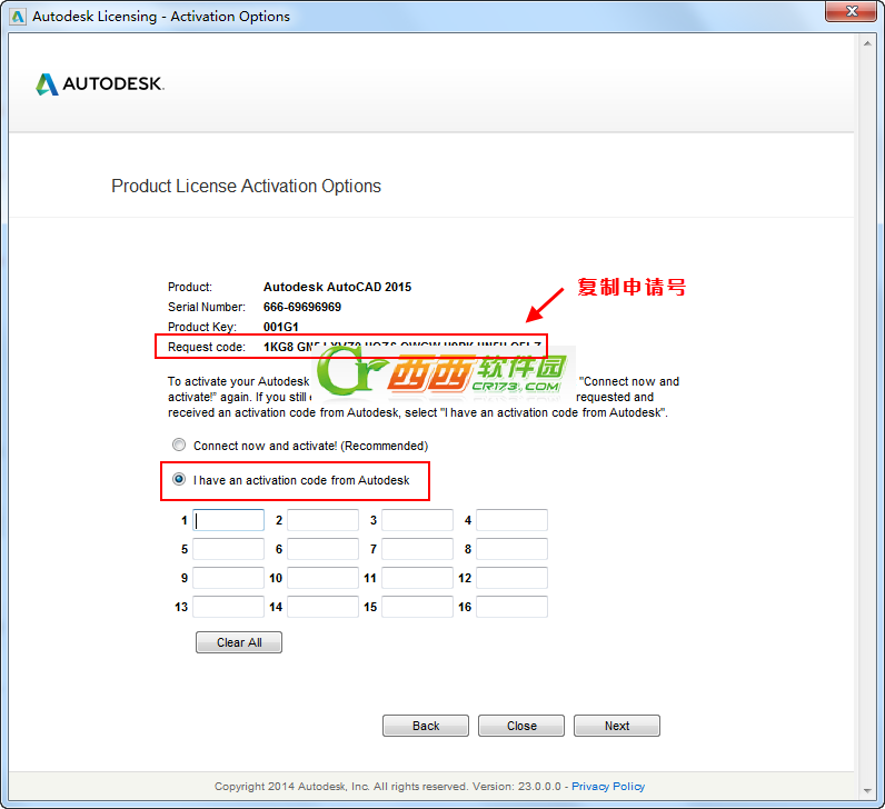 9、现在我们要用到上面下载的AutoCAD2015注册机,通过注册机将申请号转换成激活码。