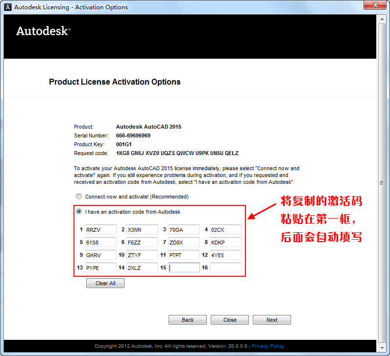 10、激活AutoCAD2015,粘贴激活码的时候,只需要选中第一个输入框,然后粘贴即可。所有的激活码会自动填充。