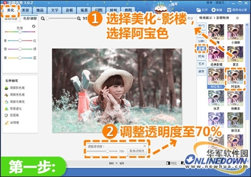 1、在软件下打开待处理的照片,进入“美化”菜单下,选择“影楼”特效分类,点击“阿宝色”特效,并且调整透明度至70%,一键提亮人物肤色。