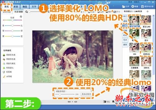 2、接着选择“LOMO”特效分类,分别使用透明度为80%的“经典HDR”和20%的“经典LOMO”特效,进行特效叠加,为图片增加层次感。