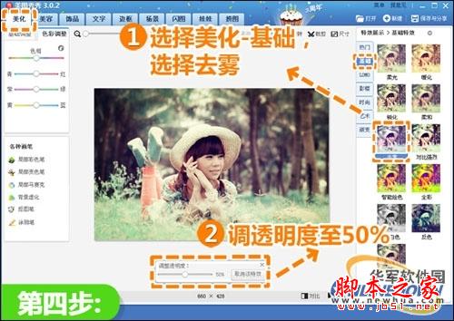 4、继续在“美化”菜单下,选择“基础”特效分类,点击“去雾”特效,调整透明度至50%,使图片看起来更加的清晰。