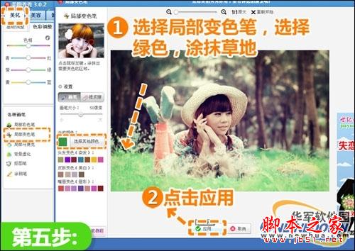 5、最后点击“局部变色笔”,选择“其他颜色”按钮,用深绿色使草地色调更深,这样就大功告成啦!