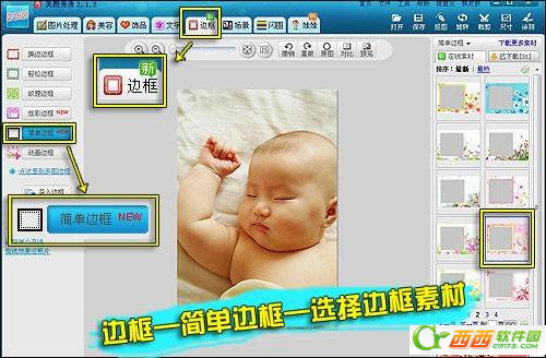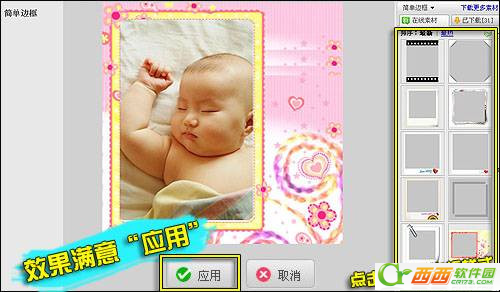 2、加边框。点标题栏上的“边框”图标切换至边框页面,在页面左侧点击“简单边框”图标后,页面右侧会出现很多边框素材可供选择,在喜欢的边框上单击一下,页面会自动跳转到边框编辑框,这时就可以看到宝宝照片加上边框的效果了,如果不满意可以点右侧的素材更换边框,效果满意点“应用”。
