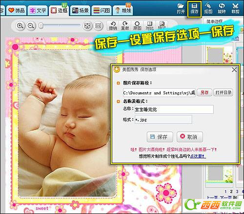 3、保存。图片做好后点标题栏上的“保存”图标,在弹出的保存选项框里设置好保存的路径、名称等点保存就OK了。
