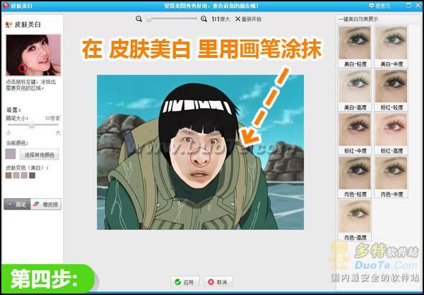 4、到“美容”菜单下,用“皮肤美白”里面的画笔涂抹素材,让素材的肤色更接近小李的肤色