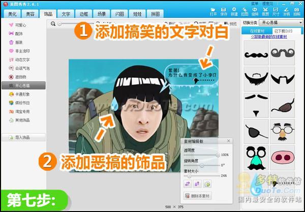 7.到“文字”菜单和“饰品”菜单中,分别给图片添加搞笑的对白文字以及一些搞笑的素材
