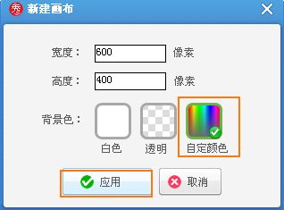 新建按钮,画布的高度和宽度都可以是默认的600*400像素即可,当然也可以设置为自己想要的尺寸大小。然后点击自定颜色,选择为黑色,再点击应用。