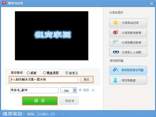 到这里荧光字体也算是制作完成了,我先教大家如何输出吧,点击右上角的保存与分享按钮,紧接着就会弹出保存与分享的窗口了,然后选择储存的位置即可,图片格式默认的是jpg格式。在右上角还可以把制作好的图片分享到QQ空间、微博等快捷途径哦,直接点击就可以跟你的好友们分享了哦。