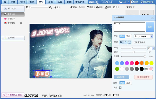 点击文字进入到文字编辑窗口,点击输入文字即可在文字编辑框输入文字啦,如:狸窝家园,这里输入的文文字默认的是静态文字,还有漫画文字、动闪文字,还有一些文字模板可以套用了,这些大家可以试试,在这里就不多说啦。