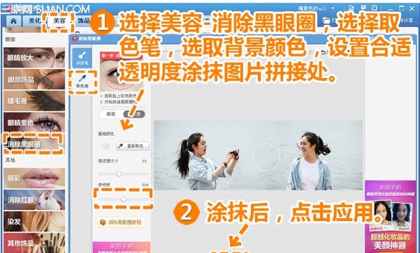 3、为了更好地融合两张图片,我们要对图片拼接处进行融合。进入“美容”菜单下,选择“消除黑眼圈”功能,并设置合适的画笔透明度,然后用适当大小的画笔在拼接处反复取色并涂抹,用点击涂抹的方式即可使拼接处有很好的过渡并达到完美的融图效果!
