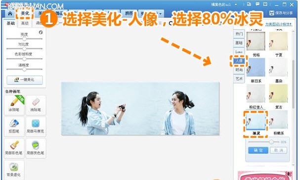4、然后选择“美化”模块中的“人像”,选择80%冰灵,提升整个画面的亮度。