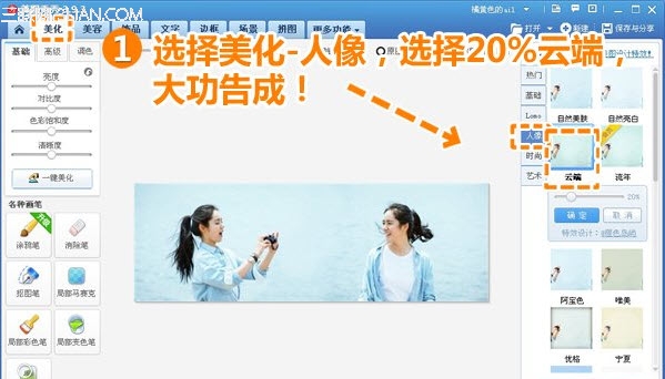 6、择“美化”模块中的“人像”,选择20%“云端”,这样就大功告成啦!