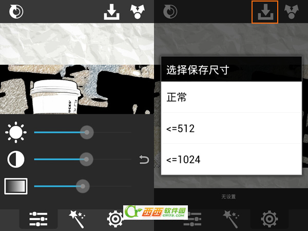 而用户点击底部第一个图标就可以对素描效果进行更仔细的设置,照片修改完后,点击右上角的保存按钮,可以保存不同大小的照片。