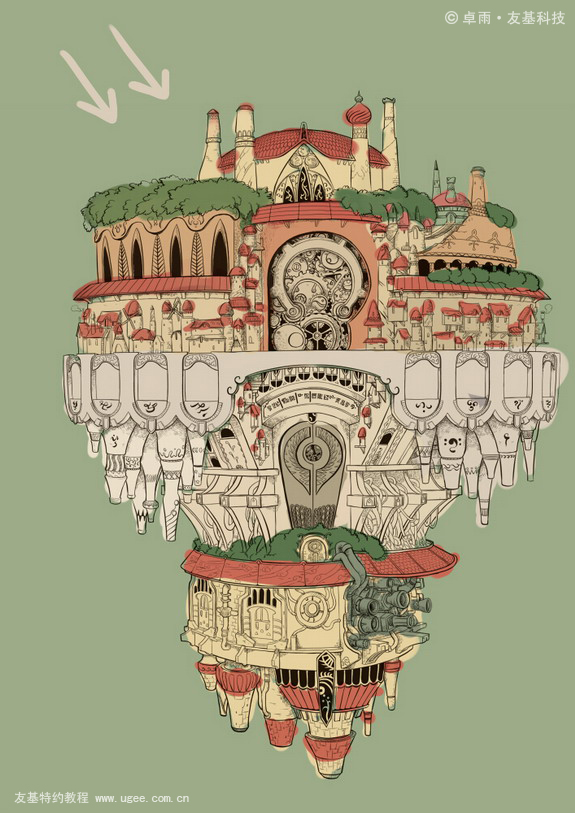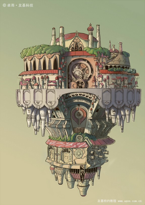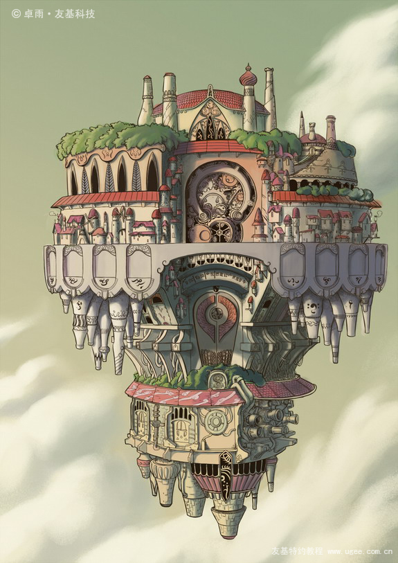 18.用细小的笔将下部分的细节勾画出来。增加天空的颜色变化。
