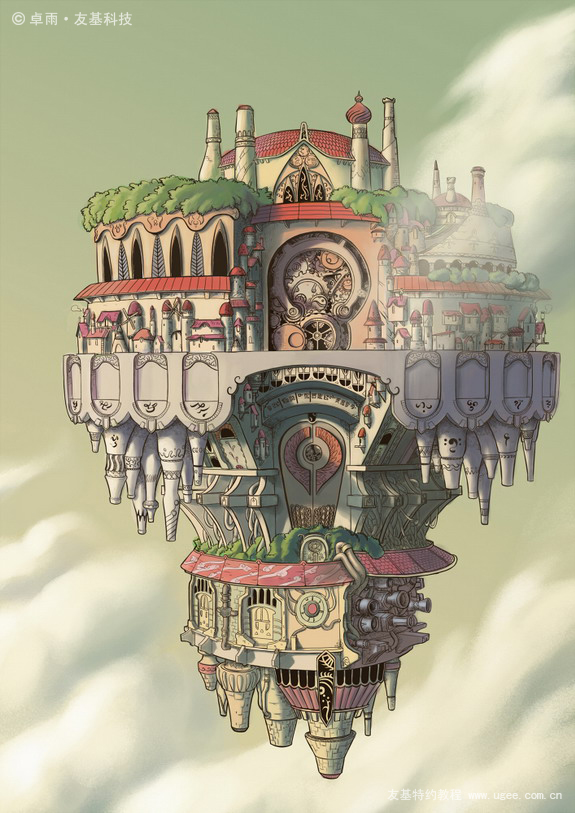 22.回到画面本身,在前面加上云雾,强调了空间感,同时把其他的云彩亮部提亮一点,再将底部觉得单调的颜色稍做修改,这张画就可以完工了。