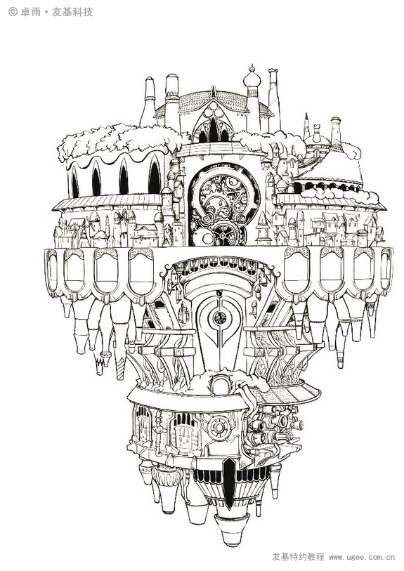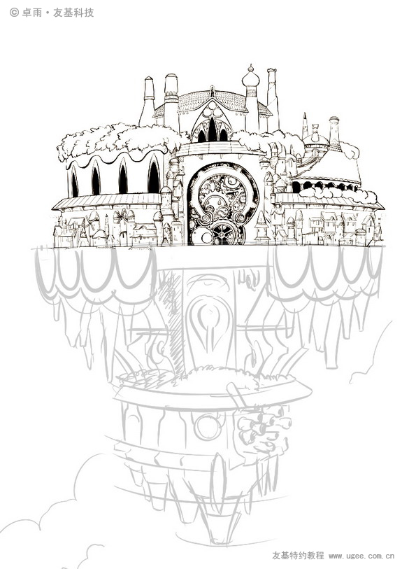 这个时候推荐使用一些颜色,不要用全黑,因为如果有颜色信息的话回头可以调整颜色。我的习惯是画多少,就把下面图层的草稿擦掉。在绘画的过程中可以不断地把自己的想法加入。这张图的右边城堡我就改变了草图的想法。
