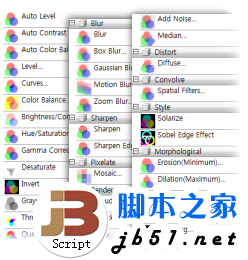 颜色调节过滤器:自动水平,自动对比度,自动颜色平衡,级别,曲线,色彩平衡,亮度/对比度,色相/饱和度,伽玛校正,去色,反转,灰度,阈值,量化,直方图均化,色调分离。