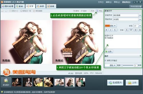通过上述两种水印添加的方法介绍,我们不难发现在美图淘淘中可以很有针对性的为宝贝图片添加各种个性水印效果,提升网店印象同时又防止图片被盗。其实, 美图淘淘还带有许多特别针对网店应用的美图功能,比如批量添加促销素材、漂亮边框等;而且,制作好的宝贝图片可以直接在软件里上传至淘宝官方图片空间,轻 松完成宝贝上架工作!