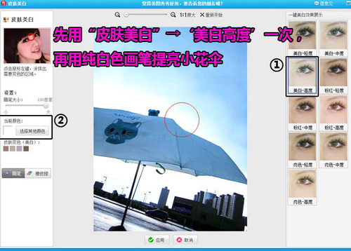 2、然后进入“美容”菜单,点击进入“皮肤美白”的编辑页面下,先选择一键“美白-高度”,再用纯白色画笔对小花伞部分进行涂抹来提高局部亮度。