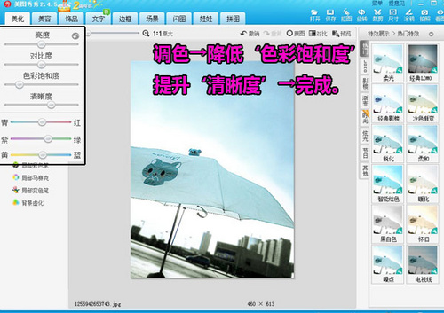 4、再返回到“美化”菜单下,对图片进行适合的调色。先将“色彩饱和度”调低,让原有蓝色变淡,再调一些绿色,图片就会有青蓝色的淡彩效果,非常有FEEL。最后调一下清晰度就大功告成啦!