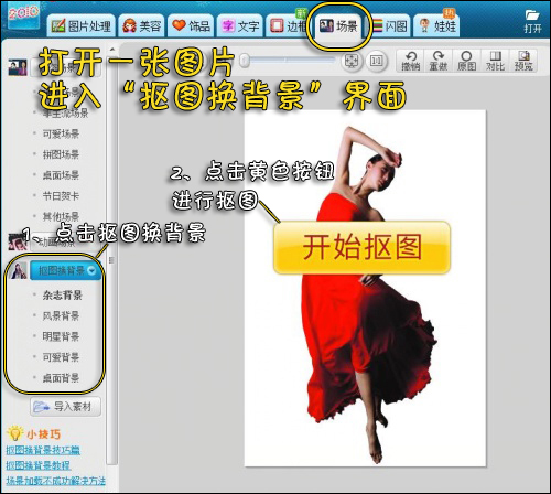 1、打开一张图片,最好是人物的全身图。进入“场景”标签下的“抠图换背景”功能,点击黄色按钮,对图片人物进行抠图。如图2所示。