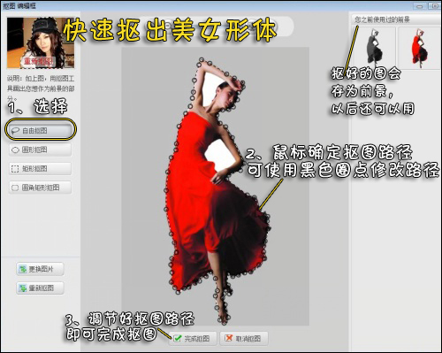 2、利用“自由抠图”,用鼠标绕人物一周,快速抠出美女形体的路径。可以使用黑色圈点的增减来修改路径。如图3所示。