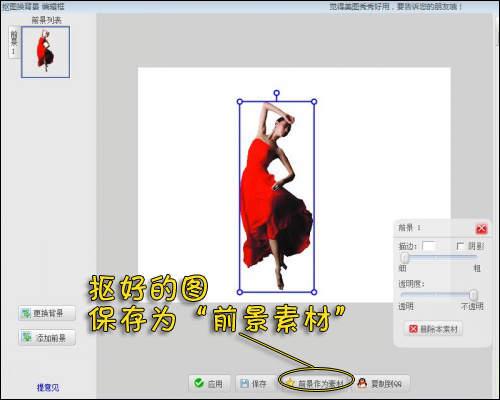 3、抠好的图,直接点击编辑页面下角的“前景作为素材”。抠好的图将保存在“饰品—用户自定义”下备用。如图4所示。