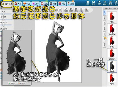 4、再将原图,利用图片处理中的黑白特效,一键变成黑白效果。如图5所示。抠好的黑白前景同图4中,作为前景素材给保存起来。