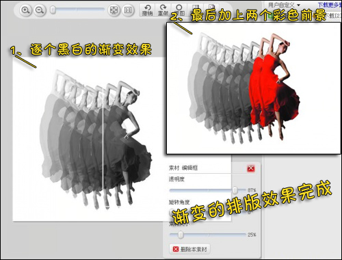 6、依照图6的步骤,调节不同的透明度,将每个前景素材错开一定位置叠加在一起。就能制作成下图的渐变效果。最后将彩色的前景素材加在前面,可以加一个到两彩色,随个人喜好。如图7所示。
