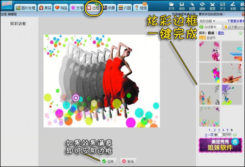 7、最后渐变效果制作好了之后,即可进入“边框”标签下的,从“炫彩边框”素材中,找个喜欢的边框添加进图片中。如图8所示。