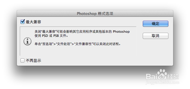photoshop的这句话其实并不适合中文用户理解。所谓“关闭”,其实就是“不保持”,因此,这个对话框其实在询问你,是否“保持”文件的最大兼容性,而不是“是否关闭”最大兼容性,使用关闭这个词,很容易让人不知所然;