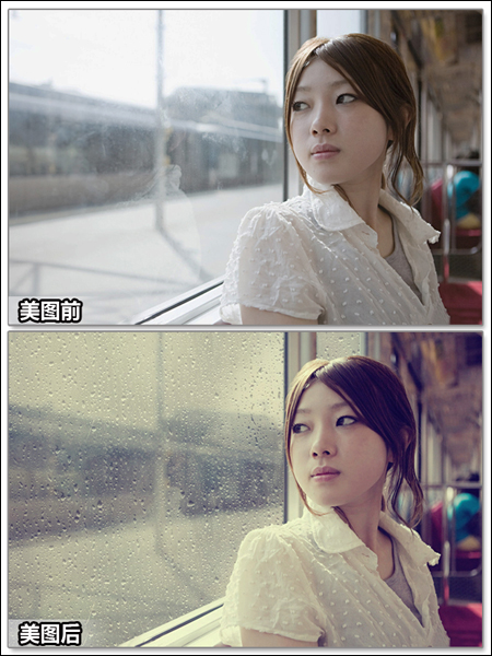 总结:在玻璃上添加水滴素材后,再使用特效进行调色,可以让素材与图片融合的更自然,最终效果图也会更加的美观。喜欢这种小清新小忧伤风格的亲们,也打开“美图秀秀”试试看吧!