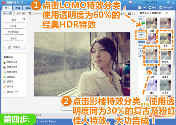4、最后使用透明度为60%的“LOMO-经典HDR”特效,再使用30%的“影楼-复古”及“影楼-粉红佳人”特效即可。