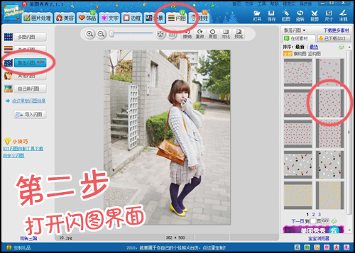 然后,选择“闪图”界面里“飘落闪图”功能,并在右边选择喜欢的飘落闪图效果。(右竖构图和横构图选择哦!)
