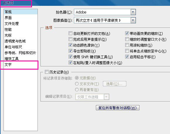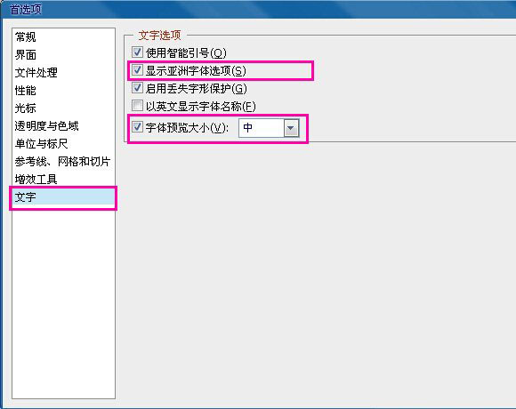 2.在该菜单左侧最下面,选择【文字】,在右侧【文字选项】下面,把【显示亚洲字体选项】和【字体预览大 小】前面,去掉勾选。
